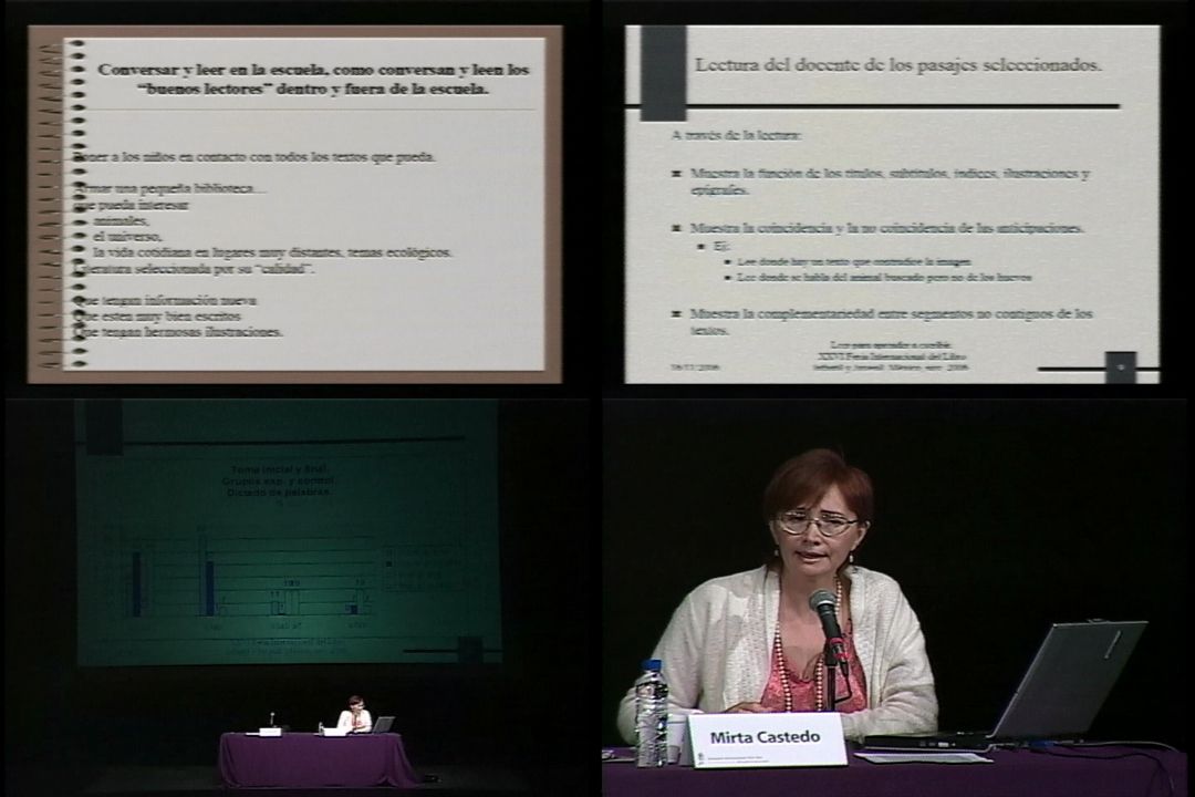 ¶¶ Para mí verdaderamente es un honor Mientras Vino ayer Y se va mañana Es decirle que Es poquito tiempo pero pues me quiero agradecer muchísimo que haya desplazado desde el cono sur, que está muy lejos a 12.000 kilómetros hasta aquí para hablar con ustedes y espero que ustedes sepan apreciar cada palabra de ellos Bueno ante todo gracias a las instituciones que organizan los invitados especialmente a Elvira y a Daniel. Quiero contarles que no hay ninguna posibilidad para empezar de apagar esos dos reflectores que me incandina en un mes andernudo hacia allá. No, no se puede, ¿no? Entonces voy a hablar así. Bueno, quiero contarles que yo tengo una cierta imposibilidad de hablar sobre cosas que no tengo ganas de hablar y entonces siempre tengo que hablar sobre cosas que tengo muchas ganas de contar. Y en esta oportunidad, lo que tenía muchas ganas de contar tiene que ver con dos proyectos de investigación en curso y entonces no pude, no me salió organizar un discurso glamoroso. Más vale es algo muy marcado por los pasos de la investigación. una de ellas está más avanzada y la otra parte está mucho menos avanzada. La investigación no me pertenece con exclusividad, yo dirijo un grupo de investigación en mi universidad que actualmente, el cual actualmente el proyecto se llama producción de textos en contexto escolar, es decir que la producción que voy a mostrar ahora tiene que ver con varias personas que voy a mencionar en cada parte, y el proyecto, que en realidad es un programa de investigación porque tiene varios proyectos de varios tesistas ahí metidos, el proyecto tiene varias preocupaciones centrales. una de las preocupaciones centrales es generar una manera de investigar en didáctica de la producción de textos. Es decir, nosotros compartimos una línea de trabajo didáctica que en América Latina, para mí, el referente más importante es de Vialerna y que también compartimos desde el punto de vista de la perspectiva de trabajo con Ana Camps y con Jean-Paul Blancart en España y Suiza respectivamente, que sostiene que para poder hablar del aula hay que investigar en el aula. Pero también tenemos claro que todavía no tenemos un modelo de investigación, un modelo metodológico de investigación del aula. Es decir, estamos ensayando maneras de investigar en didáctica y por supuesto que esto es muy discutible, muchos dirían, ese modelo existe y yo estaría muy dispuesta a discutir que no es así. Nuestra preocupación en este sentido tiene que ver con que podamos sostener cosas sobre el aula que no sean mera opinión, que podamos demostrar, que podamos demostrar el efecto diferente de diferentes maneras de enseñar sobre los alumnos. Y por supuesto que si fuésemos conductistas esto sería muy fácil, pero como no somos conductistas, esto es bien complejo porque supone, tanto por parte del alumno como por parte de la clase, una cantidad de variables que suceden al mismo tiempo muy grande y esto es incontrolable, pero no por eso, imposible de ser descrito. Bueno, esto en relación a las cuestiones teóricas duras de nuestro equipo. En relación a las cuestiones del proyecto en sí, es decir, qué aspectos de la didáctica nos están preocupando. Nosotros estamos centrados sobre la producción de textos, es decir, sobre el escribir en la escuela, en contexto escolar. No estamos dispuestos, para usar una forma de enunciación no fanática, pero sí apasionada, no estamos dispuestos a creer que sucede en la escuela lo mismo que sucede fuera de la escuela sin más. Es decir, no creemos que sea suficiente la investigación psicolingüística sobre producción de textos para explicar lo que sucede dentro del aula. Y entonces, en todos los proyectos que se incluyen en este programa, del que les voy a comentar algunas cuestiones, estamos trabajando muy fuertemente sobre las relaciones entre leer, escribir, reescribir y volver a leer, y volver a escribir y volver a reescribir. Es decir, nos preocupa esta cuestión central de qué y cómo, en eso me voy a centrar hoy, qué y cómo hay que leer en la escuela para poder escribir y también nos preocupa, pero de eso no voy a hablar tanto, qué y cómo escribir y qué y cómo reescribir en la escuela. Y ninguna de estas cuestiones es sencilla. Y tenemos también la hipótesis que si cambiamos las condiciones por las cuales se realiza este proceso, las lecturas posteriores se realizan desde otra posición. ¿Qué es lo que está...? Me voy a correr un poquitito para aquí, para poner más en pantalla. Bueno, en principio me voy a referir a cómo se conversa y cómo se lee en la escuela muy sucintamente desde la bibliografía más difundida en nuestros países. Por lo menos lo que yo conozco es de México, de Argentina y de Brasil bastante y se parece mucho. bibliografía tanto académica como gran parte de lo que pasa a los diseños curriculares. Cuando nos dicen cómo tenemos que leer y conversar sobre lo que se lee en la escuela, se nos plantea habitualmente que hay que hablar mucho con los niños, que hay que tratar de que mientras se habla con los niños se incorpore la pronunciación correcta de las palabras, de manera de prevenir errores después en la escritura, que durante esas conversaciones se mejore y reformule el lenguaje de los alumnos, es decir, que el maestro haga intervenciones en esa dirección, que se hable todas las mañanas sobre lo sucedido en la jornada, es decir, que se hable de temas cotidianos próximos e inmediatos, que se narren cuentos conocidos donde fundamentalmente el intercambio tiene que ver con recuperar los sucesos más importantes del cuento y el orden en que fueron sucediendo y que se intervenga en ese intercambio posterior a la lectura con tres estrategias básicas que están en toda la bibliografía, que son la expansión, la reformulación y la integración. No me voy a expandir en esto, casi todo el mundo lo debe conocer y si no las podemos aclarar después. En función de este tipo 